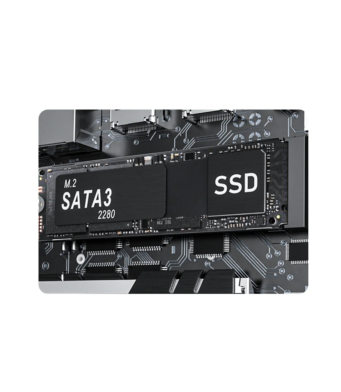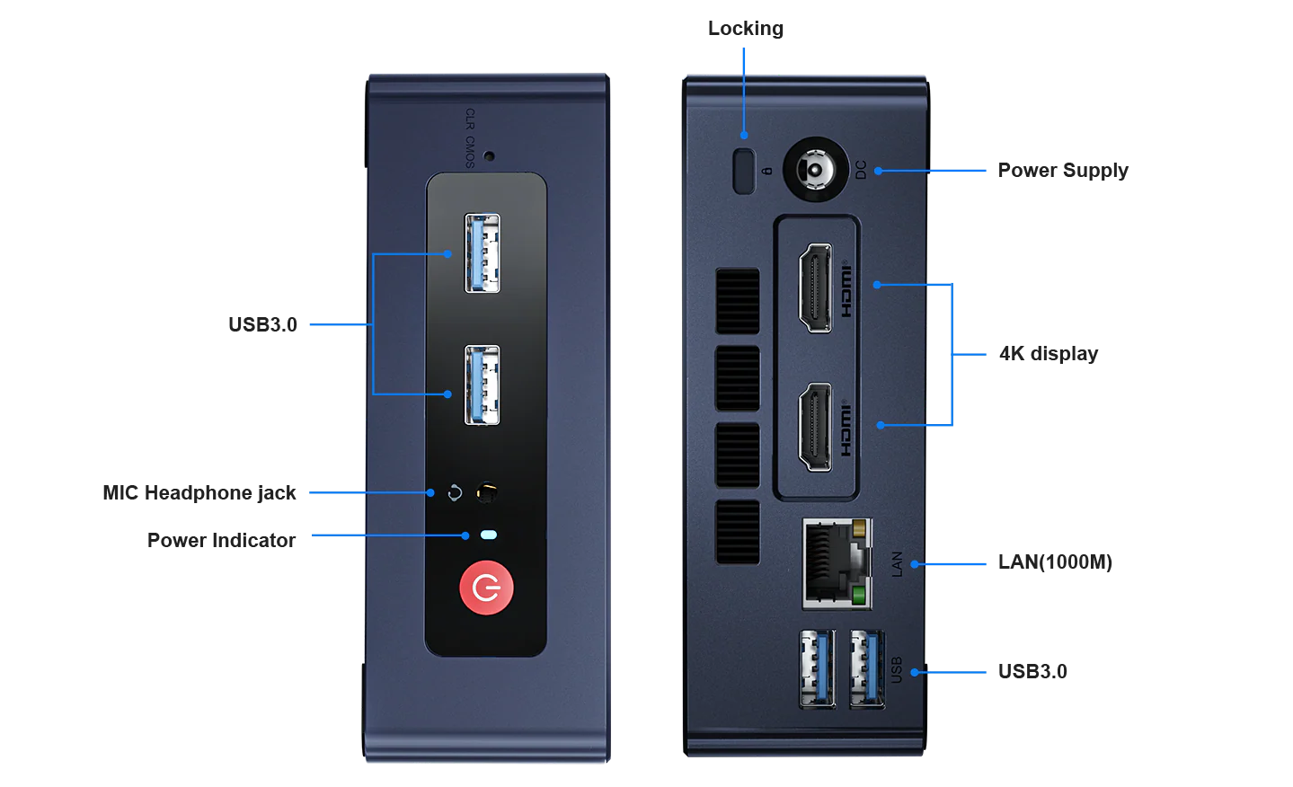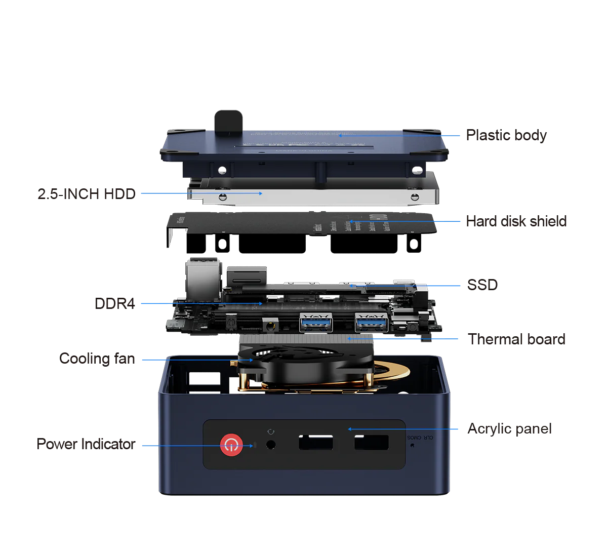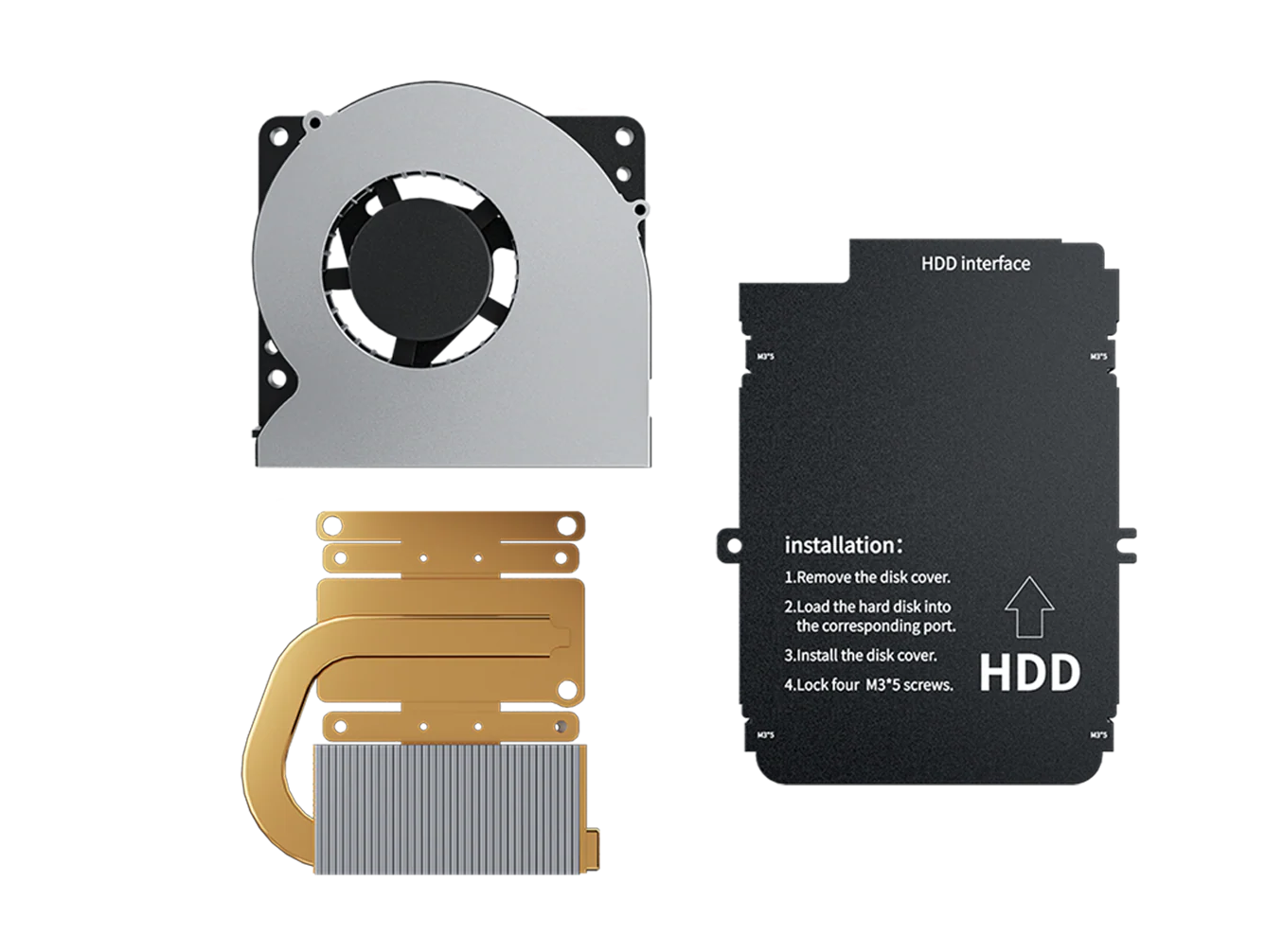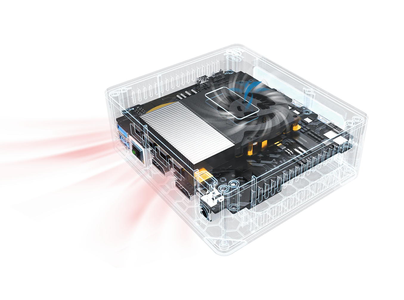 Kühllüfter + Kühlkörper + Festplattenkühler arbeiten zusammen, um für den Mini-PC eine maximale Kühlung zu bieten, die trockene Hitze von seinem Gehäuse abführen und die Temperatur seiner CPU während des Betriebs senken.