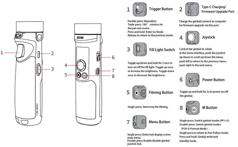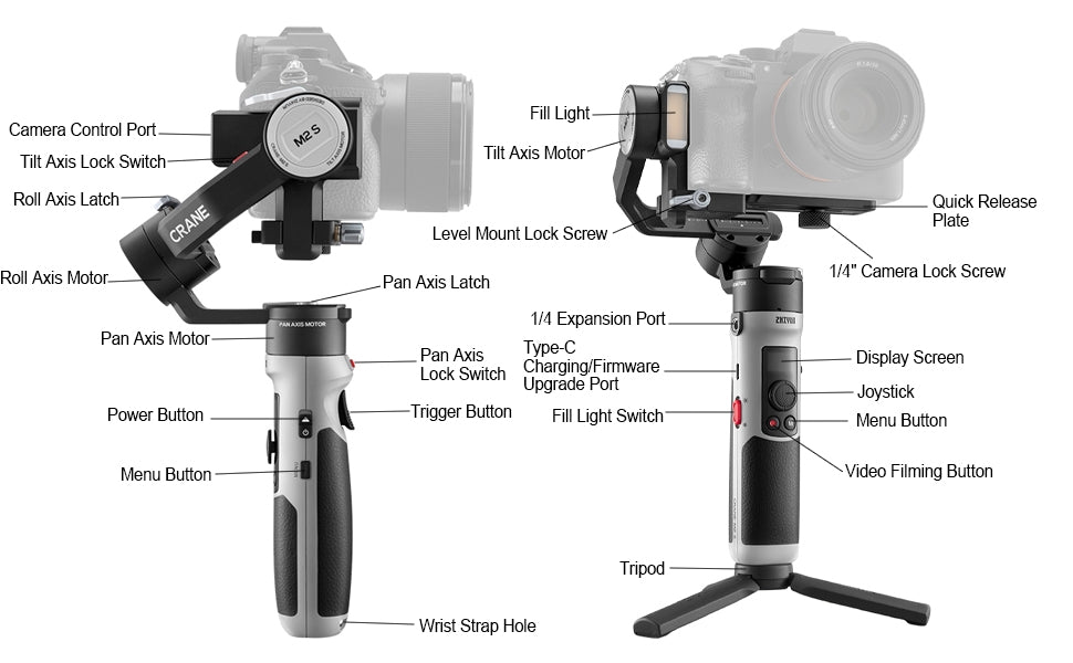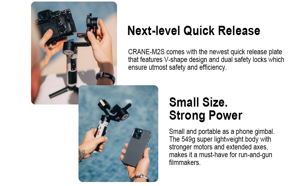 Verschiedene Aufnahmemodi verfügbar: Pan Follow, Follow, Lock, POV, Vortex, Go usw. Der CRANE-M2S hilft Ihnen, mit seinem brandneuen kompakten Design, der erweiterten Kompatibilität und dem neu hinzugefügten Aufhelllicht mehr Möglichkeiten beim Filmen zu erkunden. Nehmen Sie ihn und begeben Sie sich auf Ihre nächste kreative Reise.