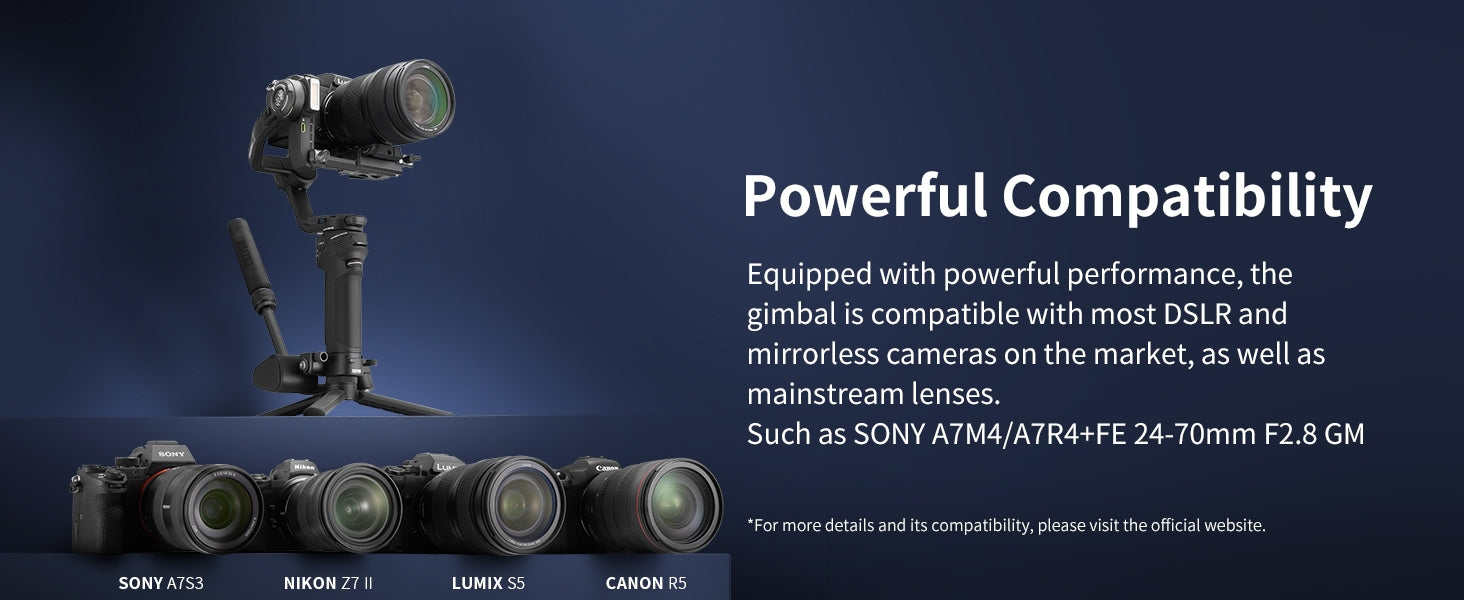 (1)Massive Nutzlast bis zu 6,5 kg – Dank der neuen SUPER-Motoren eignet sich der Crane 3S perfekt für schwere Setups wie RED, Blackmagic, Canon EOS oder Sony FX/FS.