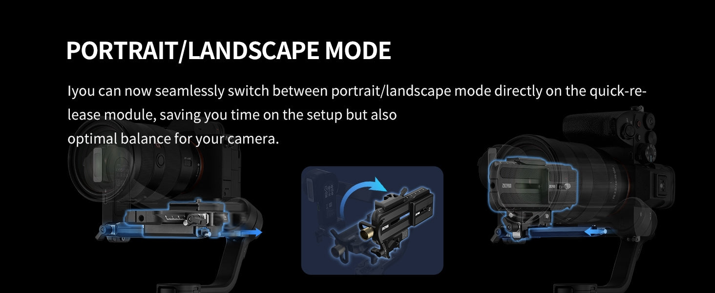 (2)Modulares Design für maximale Flexibilität – Mit dem abnehmbaren Rollachsenmodul passt sich der Gimbal sowohl großen als auch kompakten Kameras ideal an.