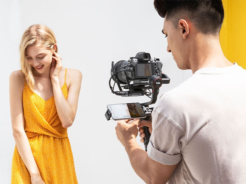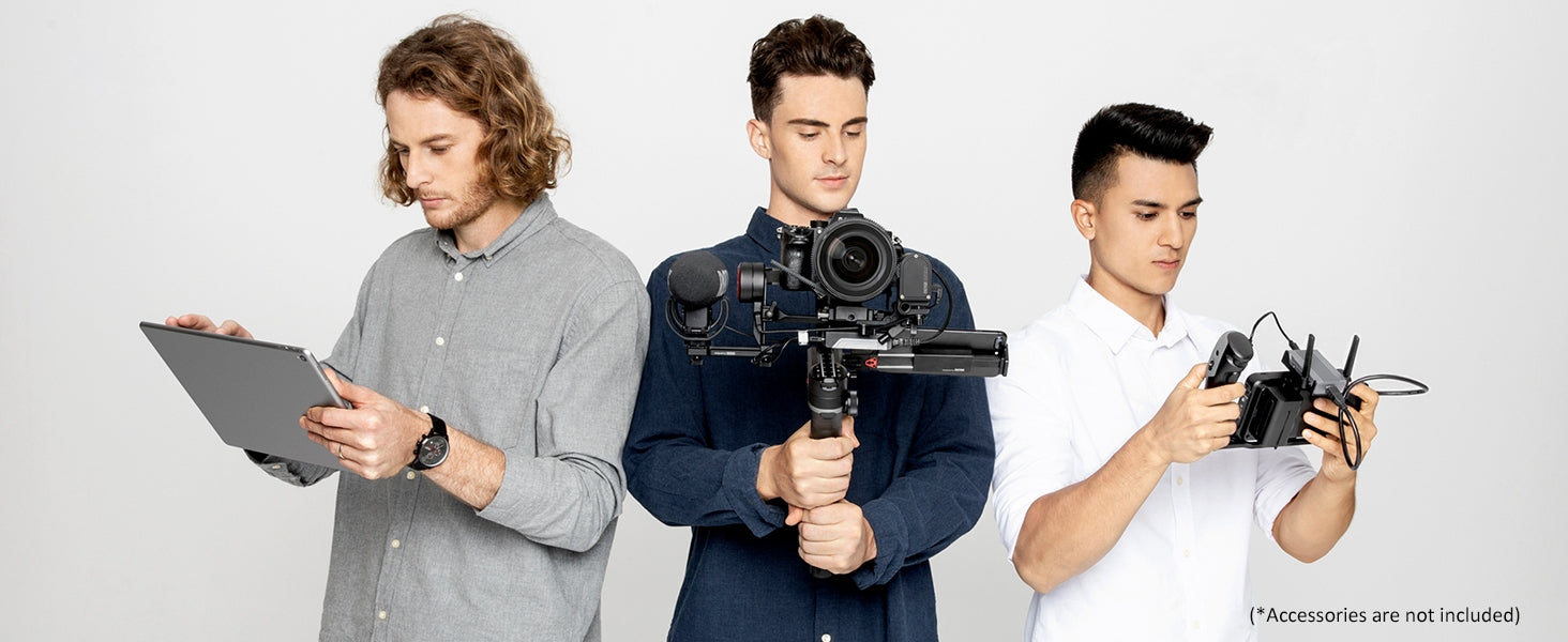 - Sind Sender und Empfänger für die Bildübertragung montiert (Zubehör), lassen sich bis zu 3 Geräte – wie Smartphones, iPads und Monitore – mit Ihrem Stabilisator verbinden.