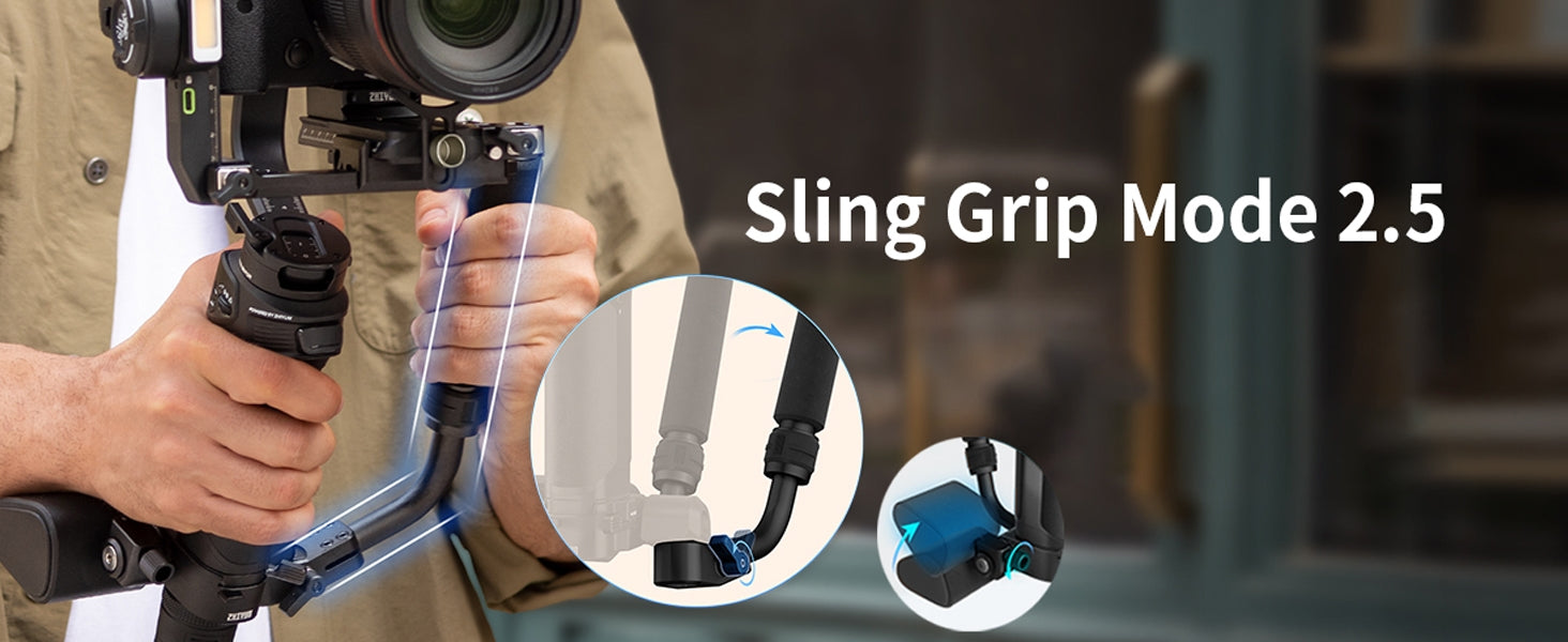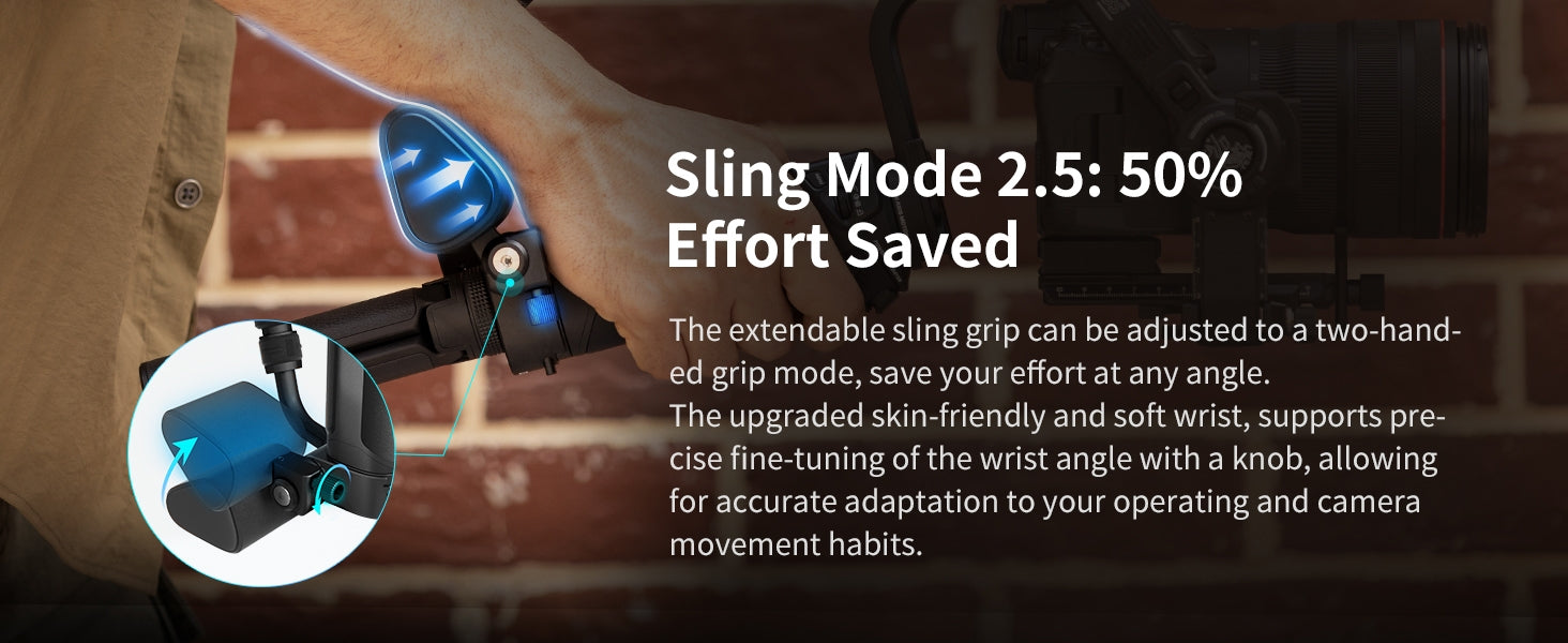 (5)Ergonomischer Sling-Griff 2.5 – Ermüdungsfreies Filmen dank erweitertem Zwei-Hand-Griff und optionalem Handgelenkstütze (separat erhältlich).