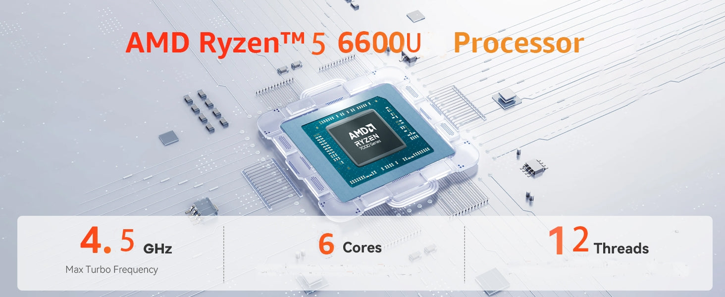 (1) AMD Ryzen 5 6600U Prozessor: Der Ryzen 5 6600U (6 Kerne/12 Threads, 4.5GHz Turbo) mit AMD Radeon 660M Grafik (1900MHz) bietet Desktop-Leistung für Büroanwendungen, 4K-Streaming und Multitasking bei geräuscharmem Betrieb (<25dB).