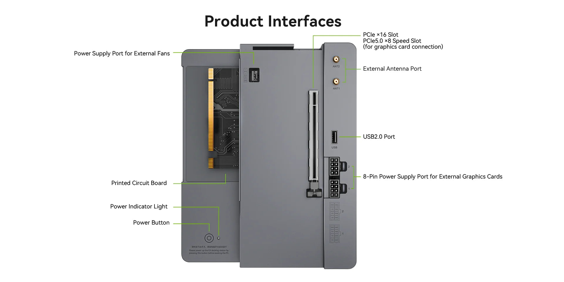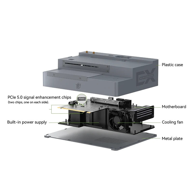 (1) Universelle eGPU-Kompatibilität:Offenes Gehäusedesign für alle AMD/NVIDIA-Grafikkarten (inkl. RTX 50-/RX 9000-Serie) ohne Größenbeschränkungen â€?maximale Flexibilität bei der GPU-Auswahl.